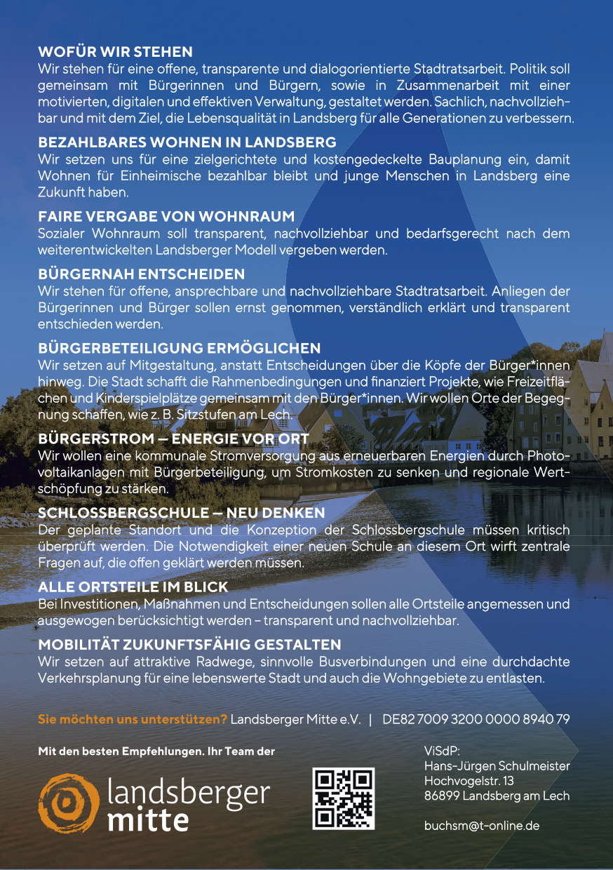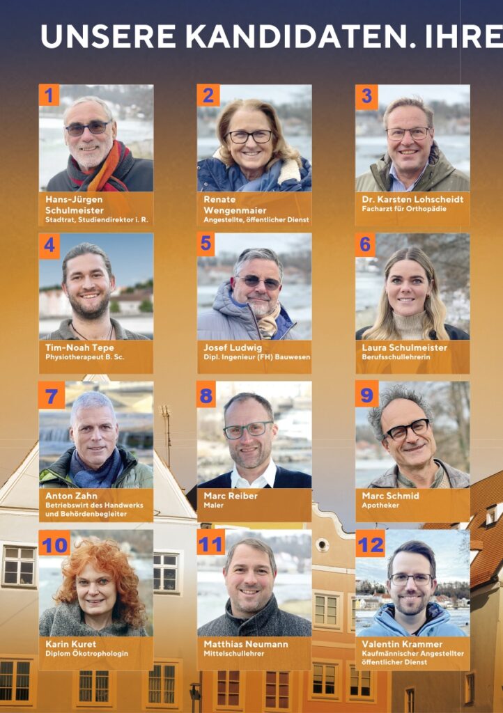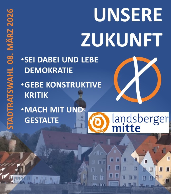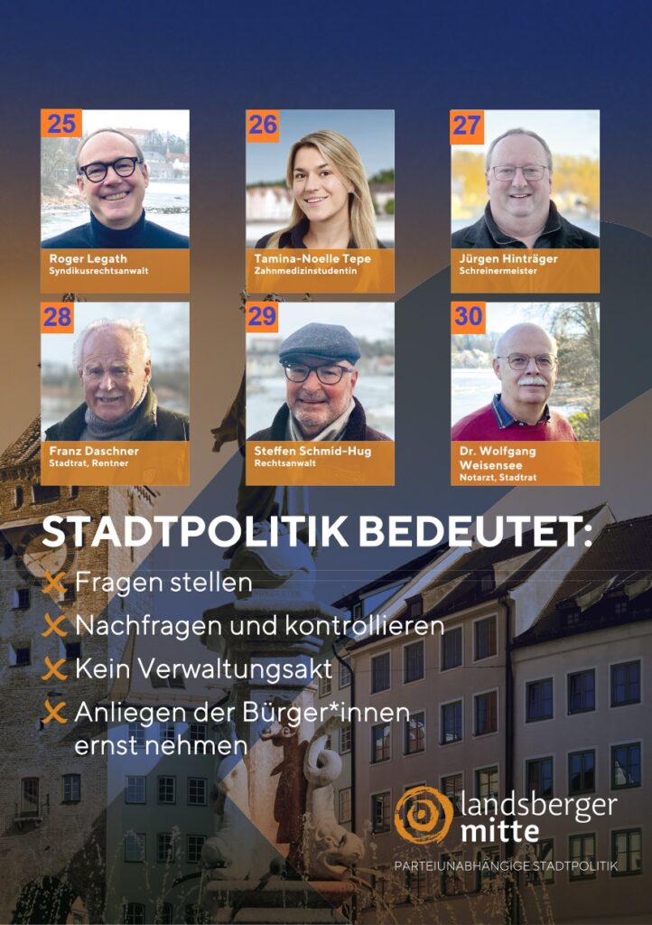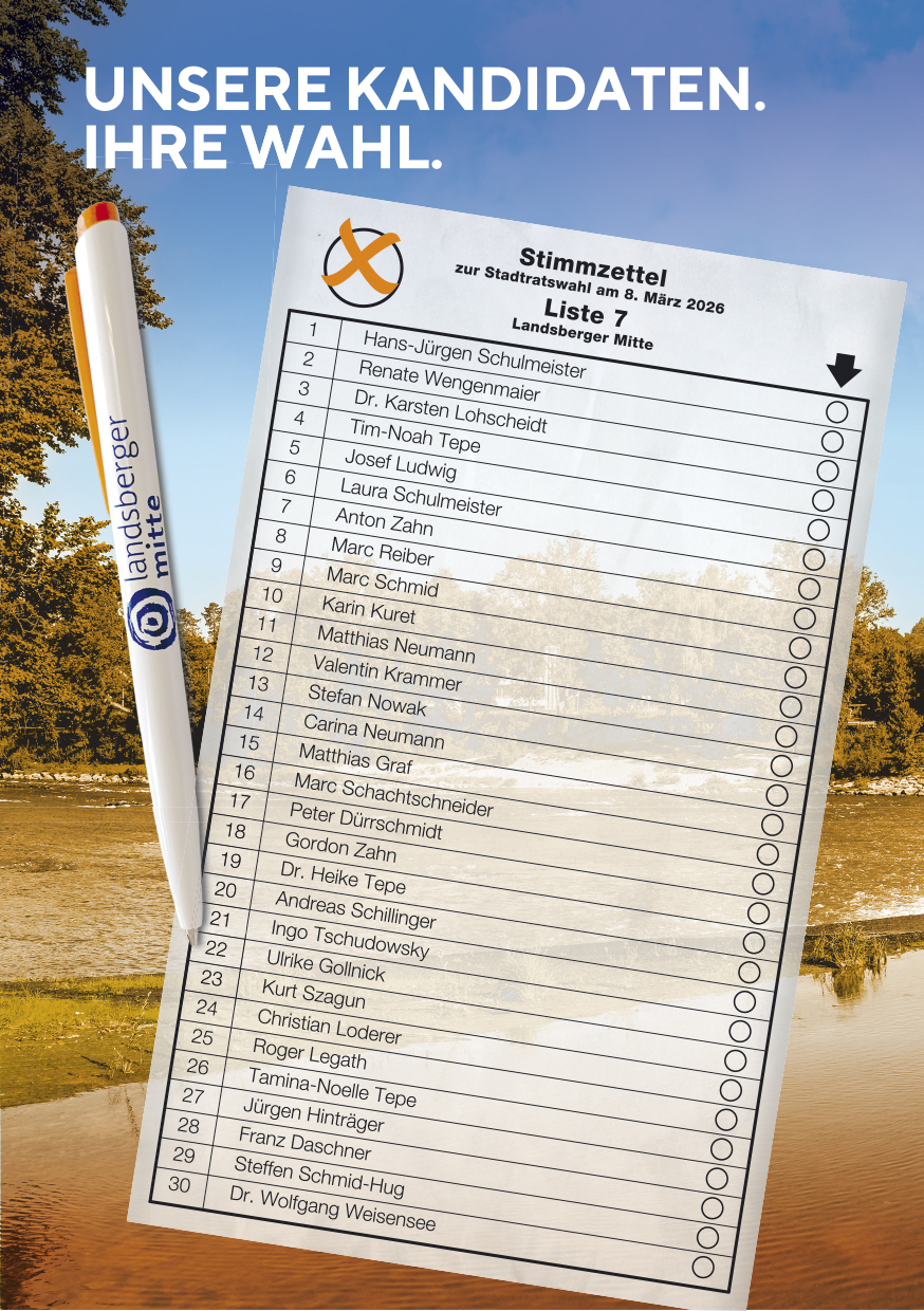 An den Stadtratswahlen in Landsberg am 08. März 2026 tritt die „Landsberger Mitte“ mit ihren 30 Kandidaten für eine parteiunabhängige Stadtpolitik an.